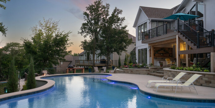 This stunning freeform pool design creates resort-style retreat on a challenging hillside lot. Story by Ann Butenas ...