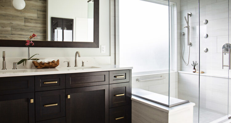 The shower, too, holds its share of clever touches. Functionality meets style with discreet grab bars, one at the bench and another integrated with the handheld shower, which blend seamlessly into the tile. Krause discovered the award-winning design at KBIS. “They aren’t usually very attractive, but this one can be tiled to match the walls, eliminating the industrial look of typical models,” she says. Adding her signature touch, Krause designed the shower as a full glass enclosure with a bench that extends slightly beyond the glass line, creating both dimension and balance in the room.