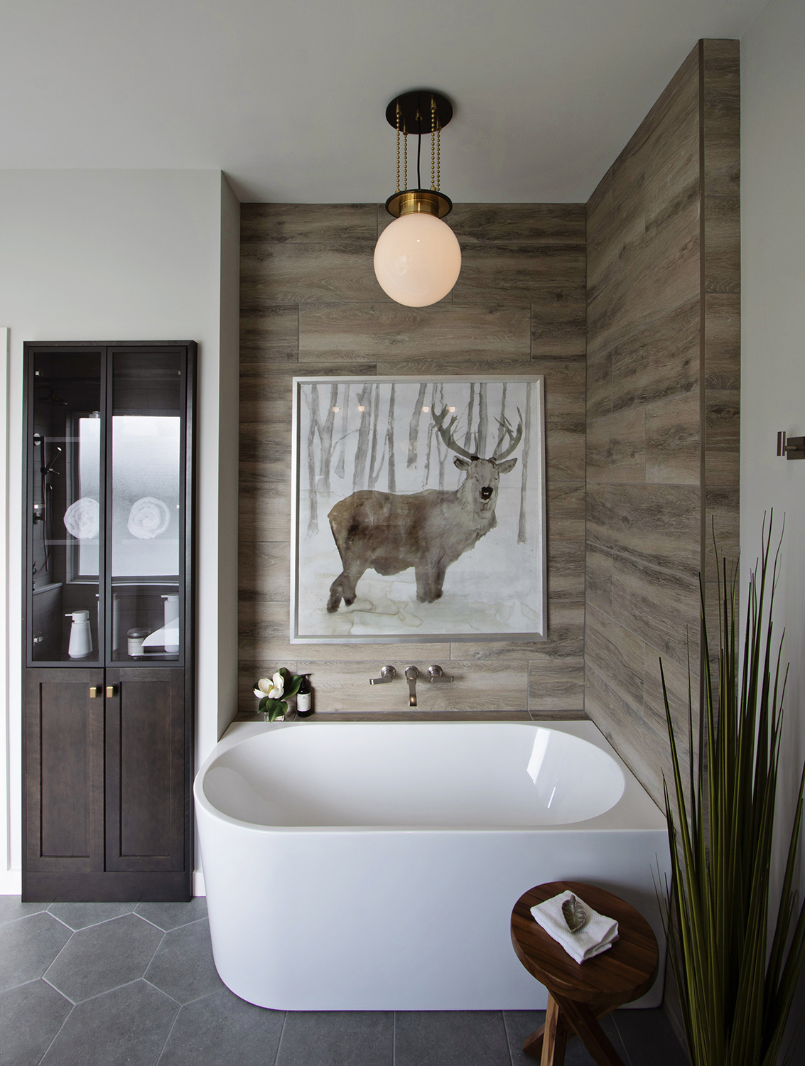 Another standout feature is the bathtub, subtly rounded on one side. “A graceful curve eases the corner, offering contrast and balance to the angular lines of the shower opposite,” Krause notes. To reinforce the farmhouse theme, wood-look tile surrounds the tub, echoing rustic cedar used elsewhere in the home but rendered in a lighter tone for easy maintenance and a cohesive look.