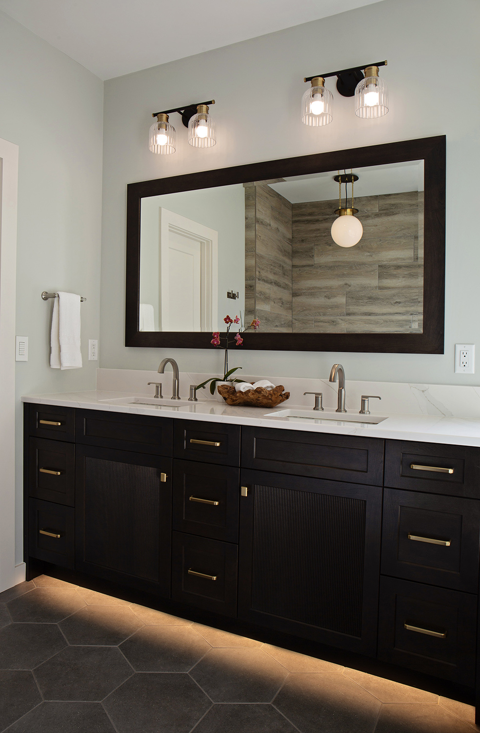 To achieve this balance, Krause drew inspiration from the home’s natural surroundings while updating rustic character to feel fresh and easy to maintain. Large-format porcelain tiles in the shower minimize grout lines for easier upkeep, while custom cherry cabinetry with an onyx stain grounds the space. A new linen cabinet, crafted by DuraSupreme, features gray-tinted glass and push latches, fitting neatly into space reclaimed from an adjacent pantry. Practical upgrades are complemented by thoughtful details: reeded cabinet doors under the sinks, cheerful quartz countertops atop the vanity, and a lit toe kick that adds a soft nighttime glow. Overhead, a sculptural globe light above the tub ties the elements together.