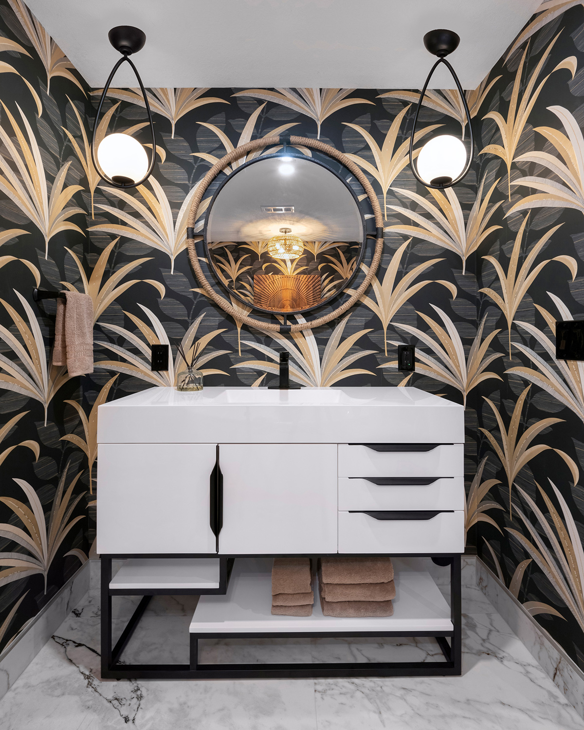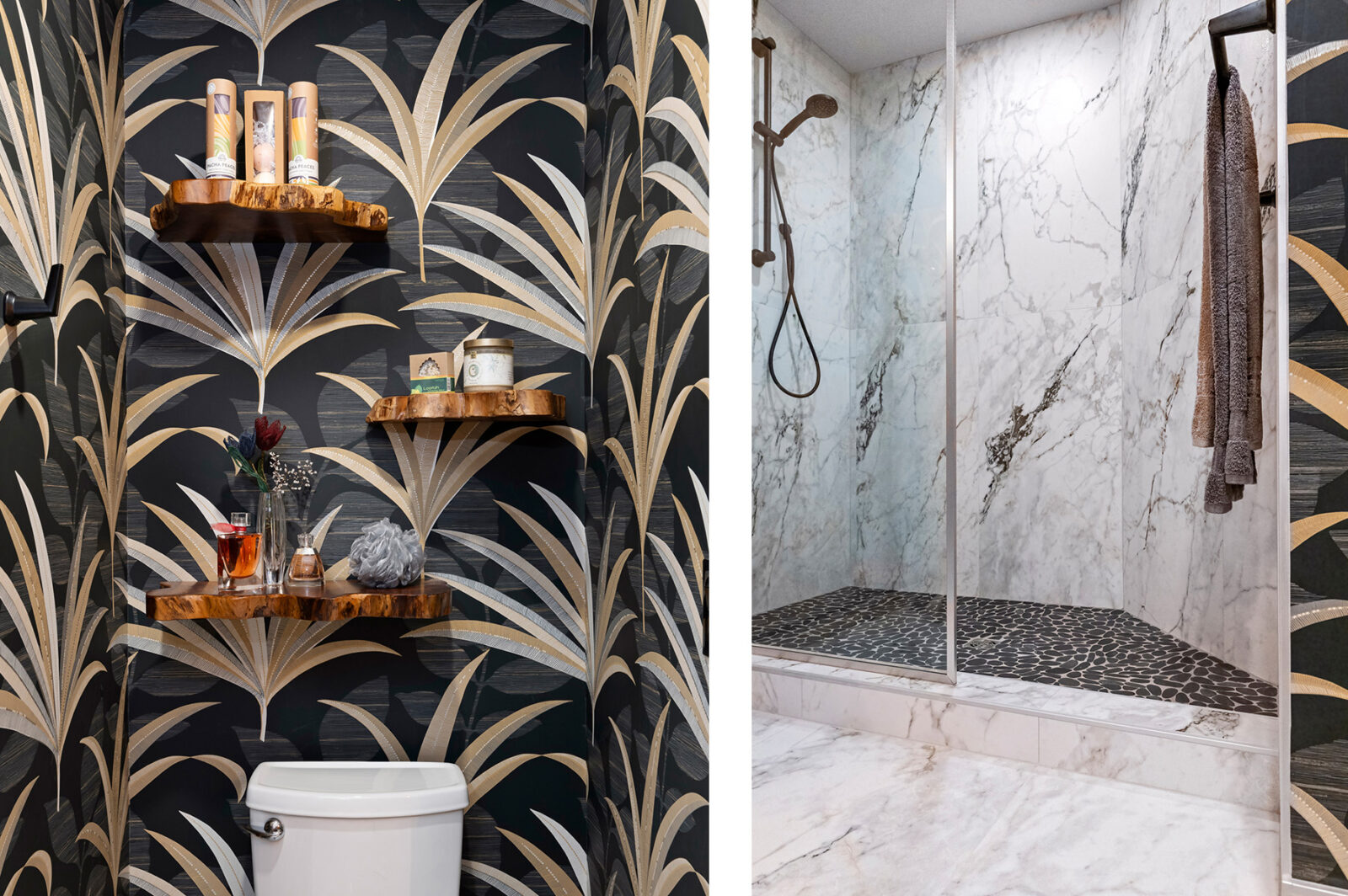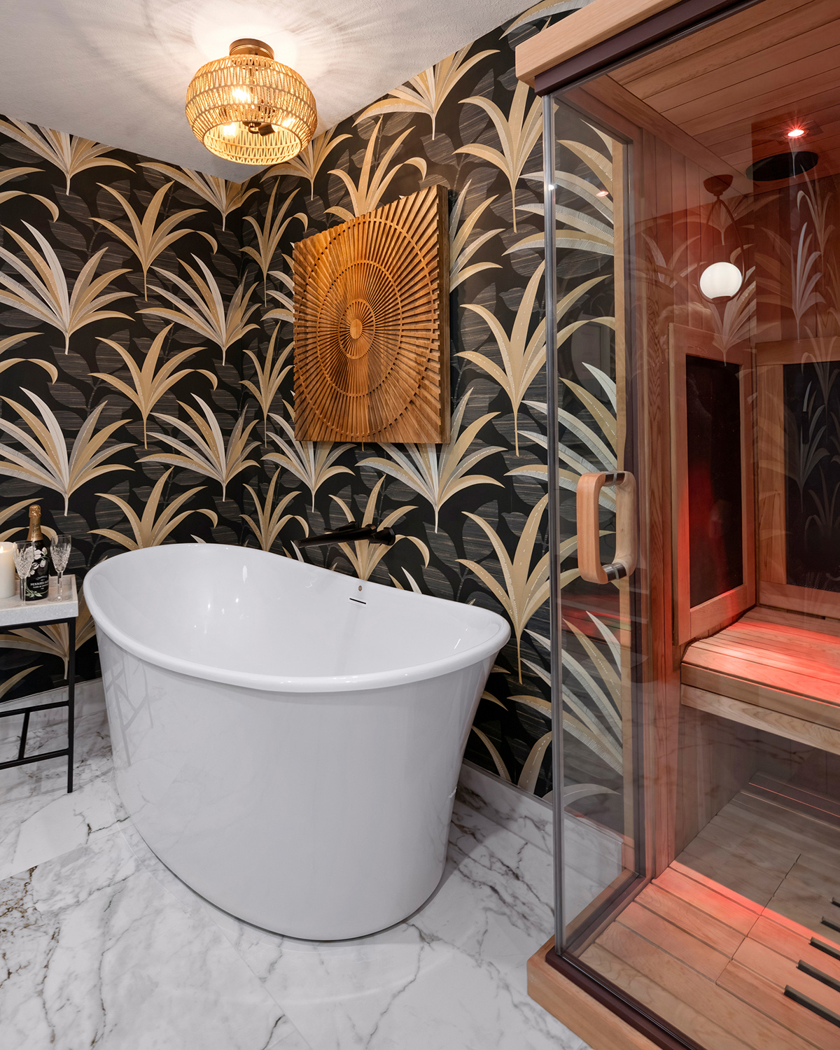 A bold, tropical-inspired wallcovering in black, brown, and white was incorporated to balance the warmth of the sauna’s wood with the crisp lines of the vanity. It became a signature element in the suite, adding personality while maintaining the spa-like atmosphere. The large soaking tub, positioned against this backdrop, serves as both a personal retreat and a family favorite.