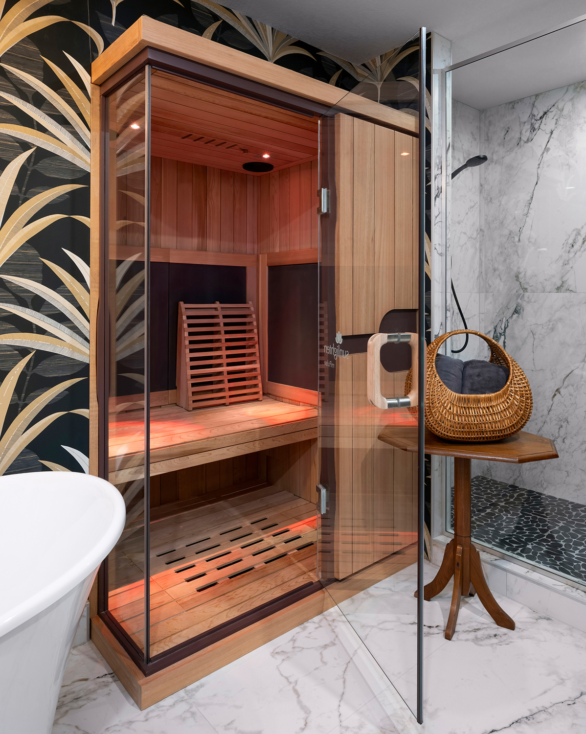 The infrared sauna became the centerpiece. After accompanying the homeowner on showroom visits, Deatherage worked the freestanding unit into the room so it would feel seamless. A soffit was added above to conceal ductwork, and the sauna’s glass-corner feature was oriented into the suite. The sauna not only supports her wellness goals but also sets the tone for the entire space. “I’m known for creative space planning,” Deatherage says. “In this room, what you don’t see is two and a half feet of the sauna that recesses into the unfinished space; it looks sleek and built in.”