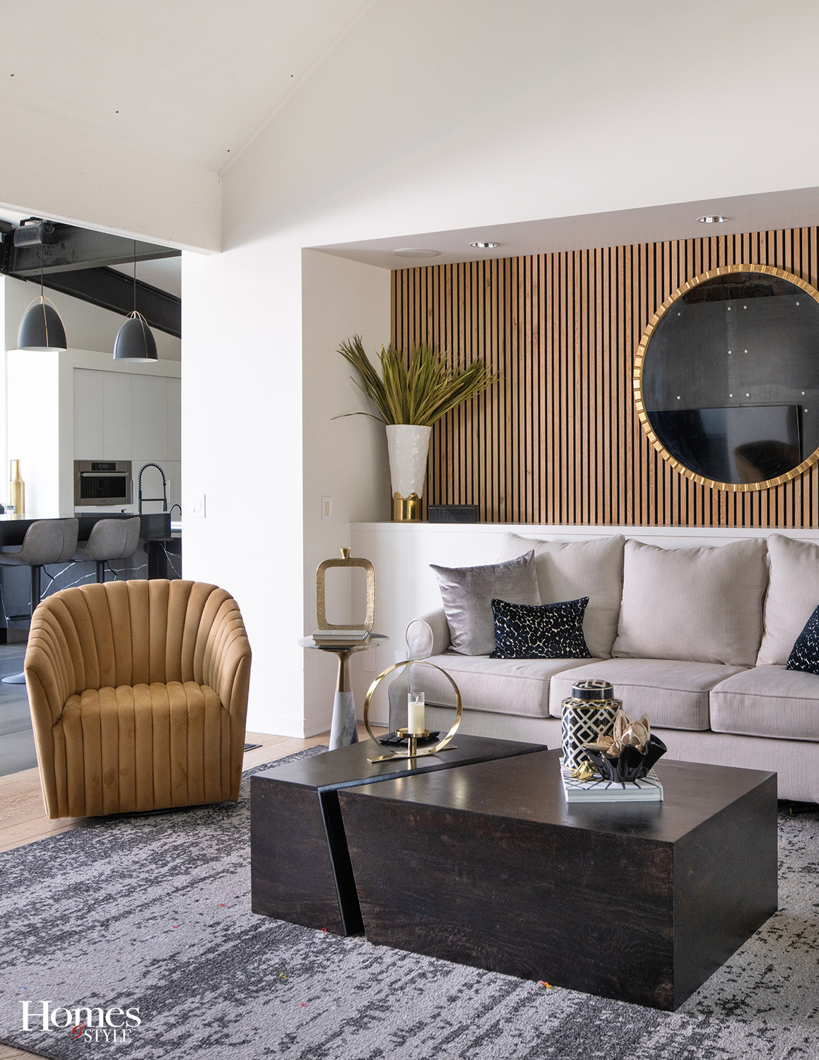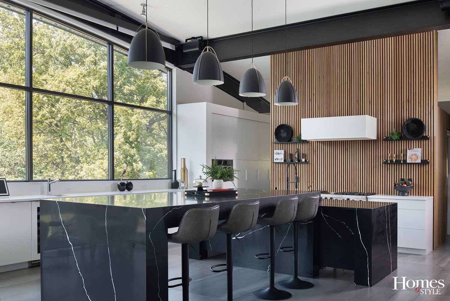 The heart of the home showcases this evolution beautifully. The gourmet kitchen features additional expansive windows that bathe the space in natural light, complemented by high-end Miele appliances including an $8,000 espresso and cappuccino machine. A dramatic waterfall island crafted from white-veined quartz serves as both a functional workspace and sculptural centerpiece, while custom teak paneling on the walls adds warmth to the sleek design. The kitchen flows effortlessly into a spacious great room anchored by a stunning forged carbon fireplace surround with industrial bolt detailing, a distinctive feature that captures the home’s unique character. This open layout has become Bryan and Cristy’s favorite spot for entertaining, where guests naturally gather between the kitchen island and the great room’s comfortable seating areas.