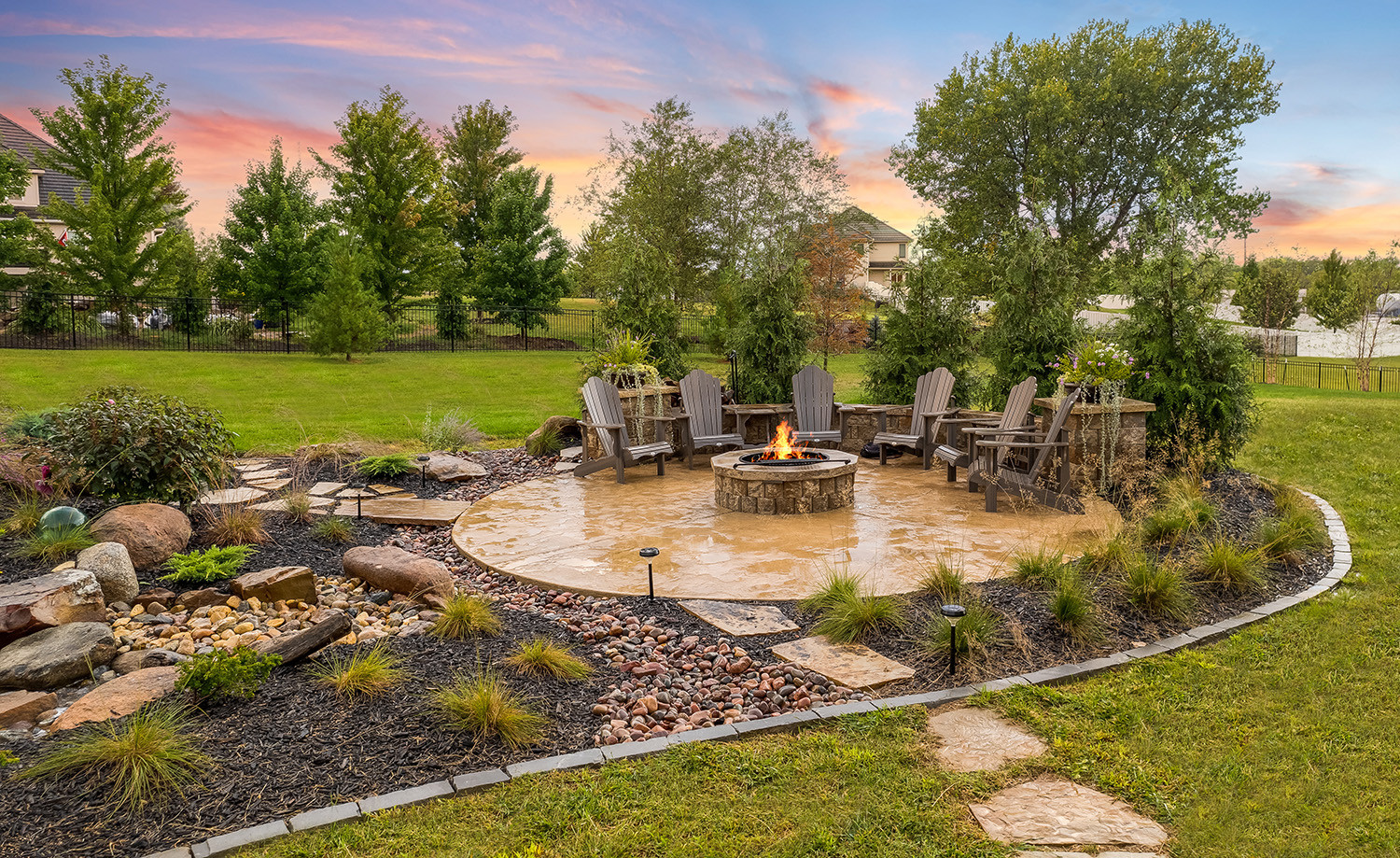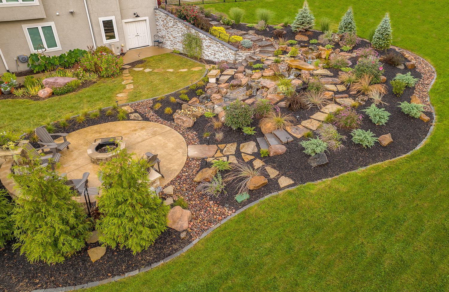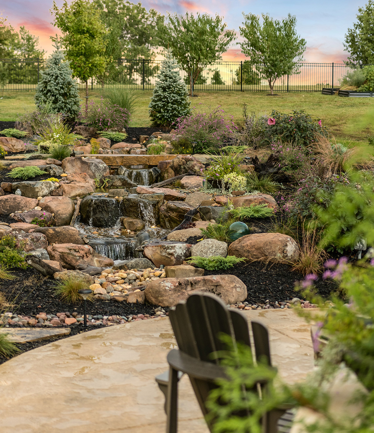 What emerged from the on-site consultation was a dual split pondless waterfall system, with two falls at the top that merge into a meandering, multi-tiered stream cascading down to a reservoir below. A stone bridge bisects the feature, tying into a winding walkway that loops the entire landscape. A circular fire pit patio, enclosed by evergreen shrubs, anchors the lower level. And throughout, granite boulders rounded, multicolored, and unmistakably Rocky Mountain, set the tone. The Colorado aesthetic was deliberate.
