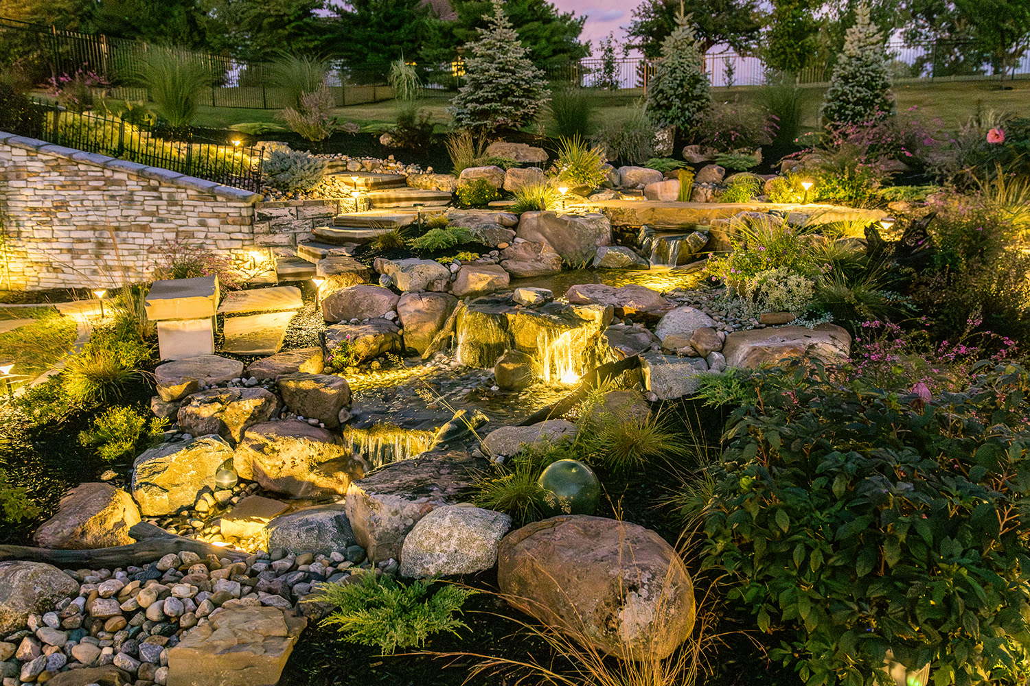 Trey’s Lawn and Landscape handled the surrounding plantings and hardscape, bringing in creeping Jenny for sweeps of chartreuse color and spreading rug junipers that will continue to fill in over time. Nighttime lighting extends the feature’s impact well beyond daylight hours, and careful attention was paid to sightlines from the couple’s screened-in porch, sunroom, and backyard-facing bedroom windows.