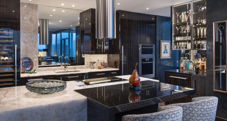Instead of a simple tile backsplash, Knapstein took the Crystallo quartzite up to the full height behind the television, creating a seamless look. Mirrors were strategically placed to make the space feel bigger while keeping the intimate, seductive vibe intact. “The design aesthetic was to create a warm modern luxury apartment feel,” Hamel explained. “The Macassar ebony veneer in high gloss finish, along with polished nickel accents, brought that luxury feeling.”