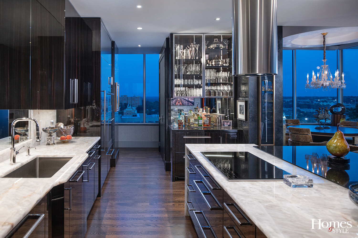 The material choices show restraint and sophistication. Custom cabinets feature high-gloss Macassar ebony veneer with polished nickel hardware that reflects light around the room. The real star is the Crystallo quartzite countertops, a natural stone chosen for its beauty and dramatic transparency and crystal structure that adds visual interest to the clean-lined design.