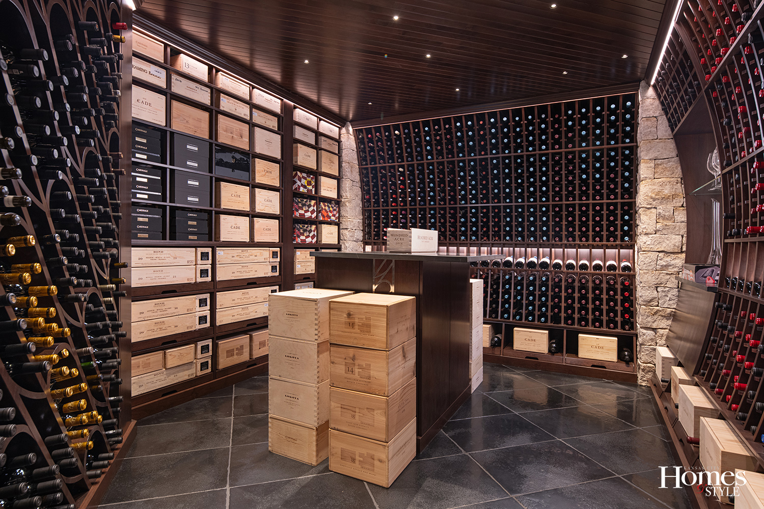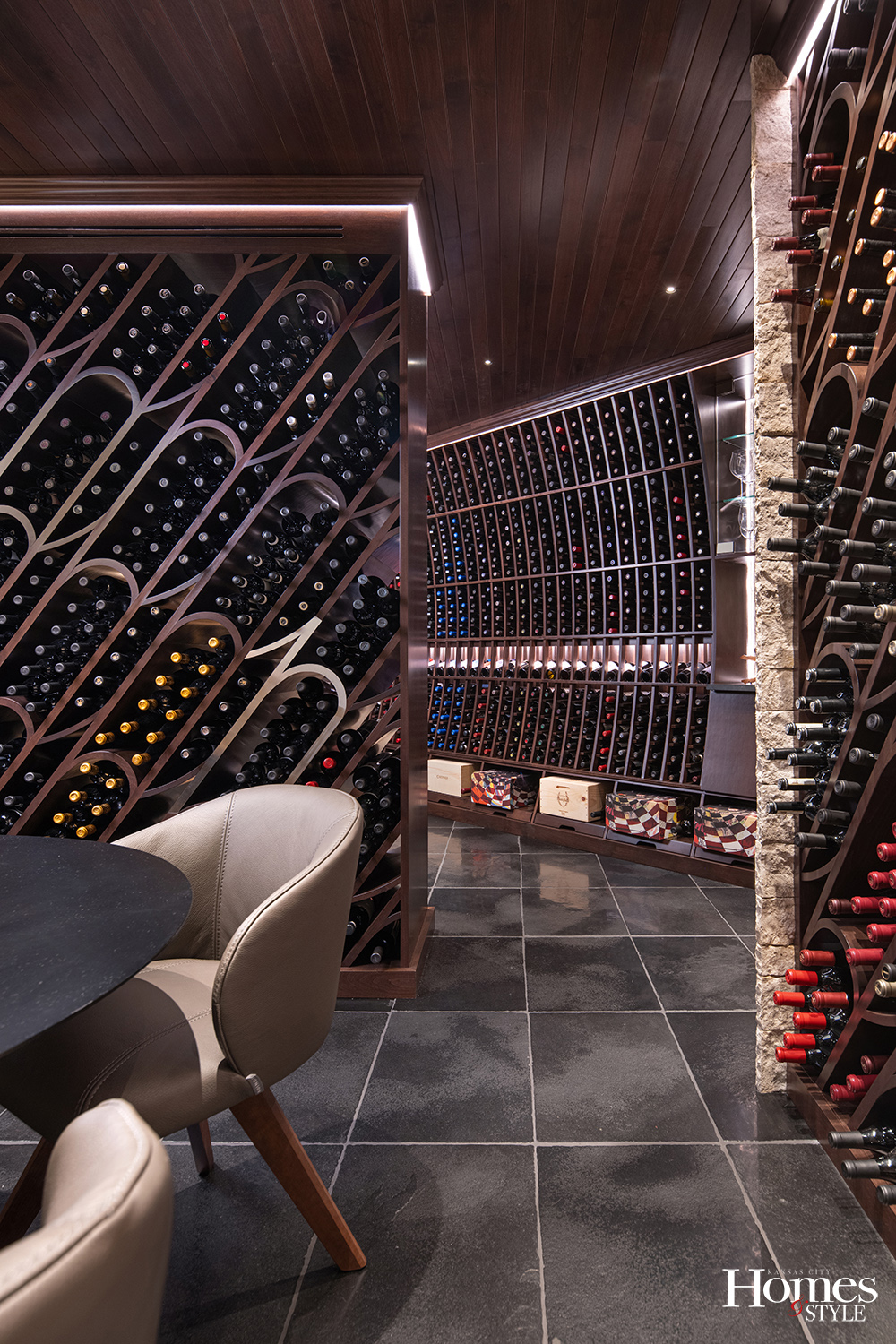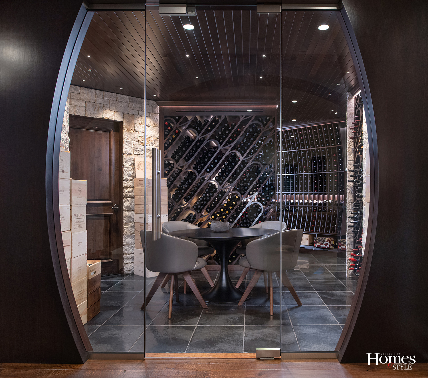 “The shape of a wine barrel inspired the curved panels on either side of the entrance,” Hamel explains. “Not only the entry, but the wine racks are curved as well, so it feels like you’re walking into a wine barrel.”  The large glass opening draws guests directly to the tasting room, offering a sense of drama rarely found in traditional wine cellars.