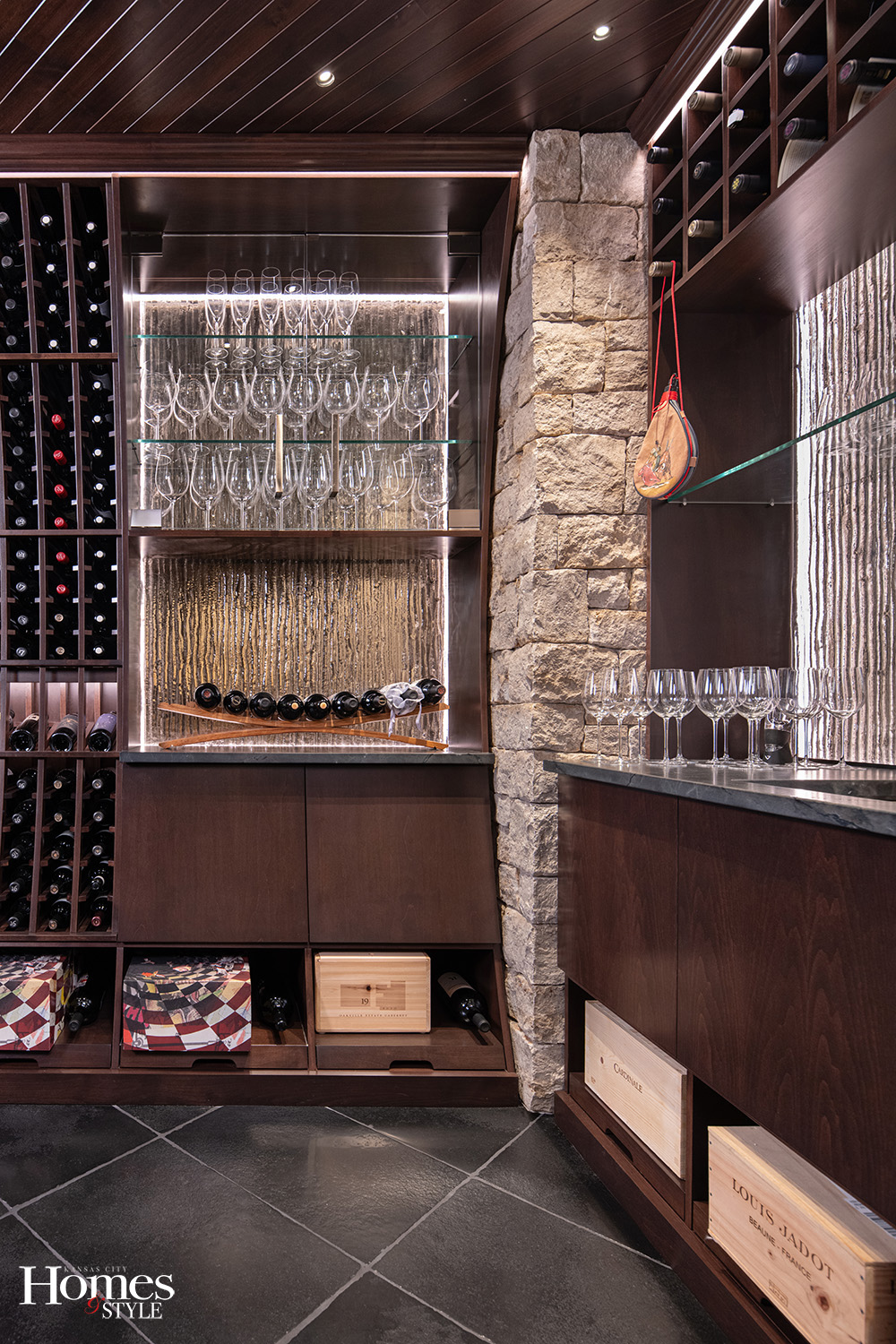 Because the home’s wood floors and dark brown stained doors were already established, Hamel used them as a foundation for the cellar’s moody palette. “We wanted to carry that color scheme in since it’s open to the rest of the house,” she says, noting that the choice of natural materials throughout reflects both the client’s taste and the home’s existing architecture.