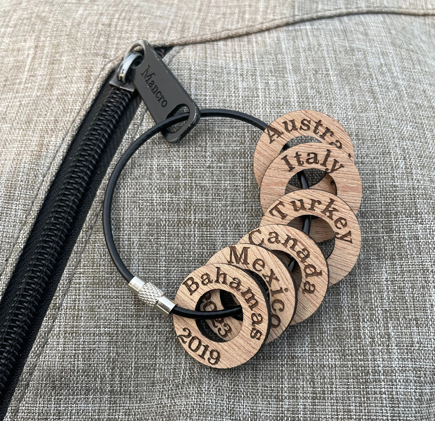 Personalized wooden travel token keepsakes, perfect for keychains or backpacks.
