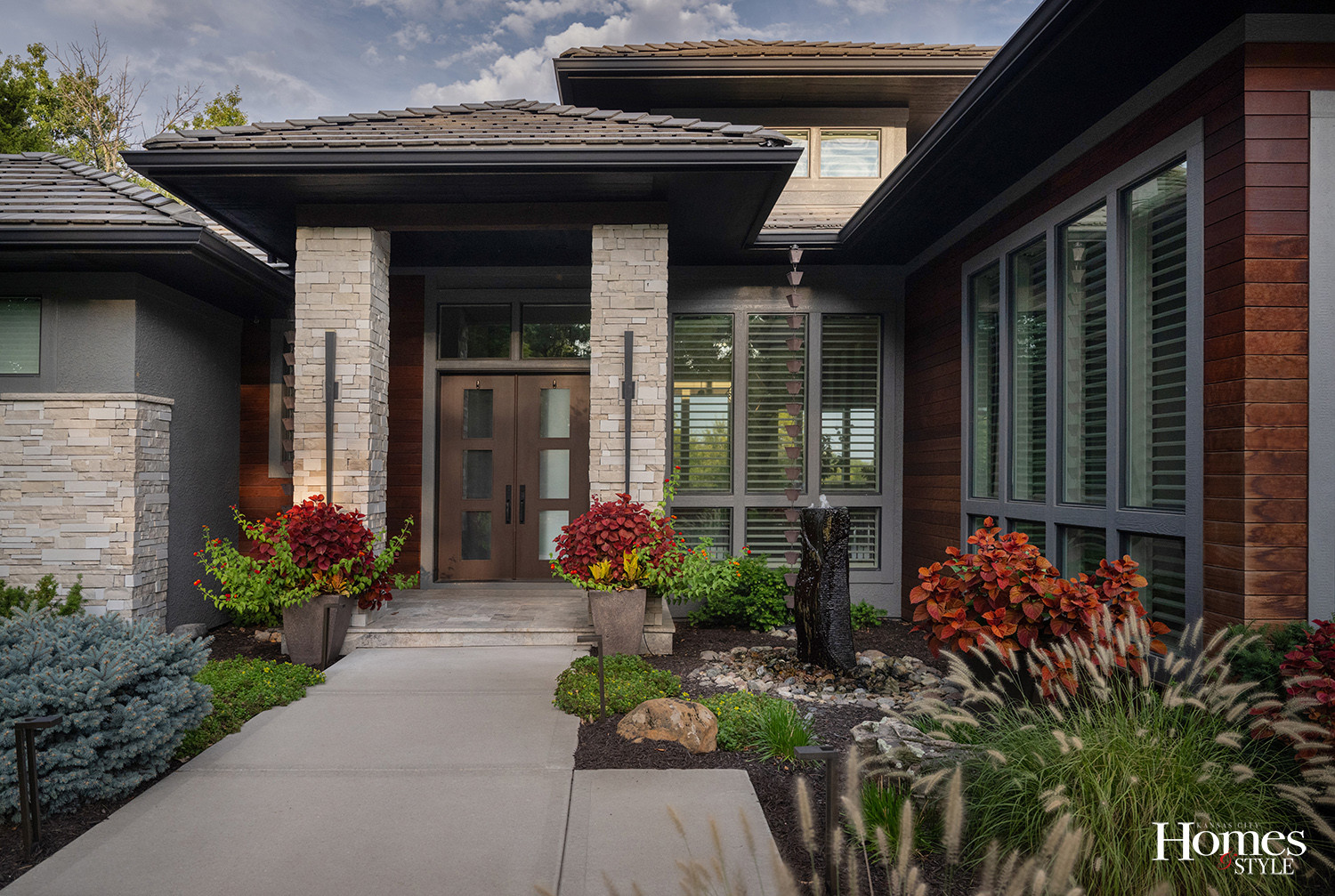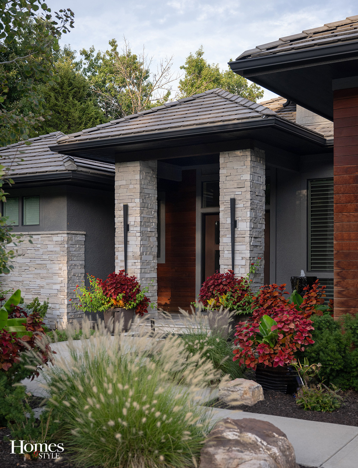 Subsequent phases evaluated plant performance. Perennials that had overtaken their beds were replaced with ornamental grasses selected for proportion, including dwarf Hameln, Miscanthus, and Karl Foerster grass. In the front yard, an overgrown and diseased blue atlas cedar was removed and replaced with a Japanese maple chosen for its ability to be trimmed and maintained within the space.