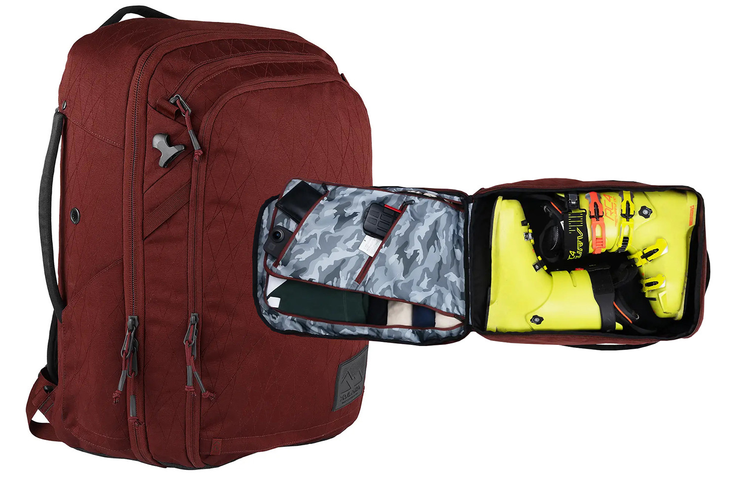 Instrumental space for ski or snowboard boots, clothing, specially made interior pockets for smaller personal items, and a secure pocket for your tablet. External helmet sling and luggage pass-through straps make transporting any type of gear a no-brainer.