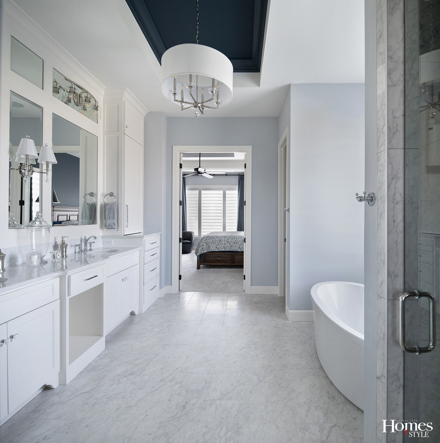 “I knew from the get-go that they were very traditional in their style,” says Angela. “Amy loves blues, so we used blue tones in tile, wallpaper, and furnishings throughout the house. We pulled in pops of blue here and there without overdoing it.”