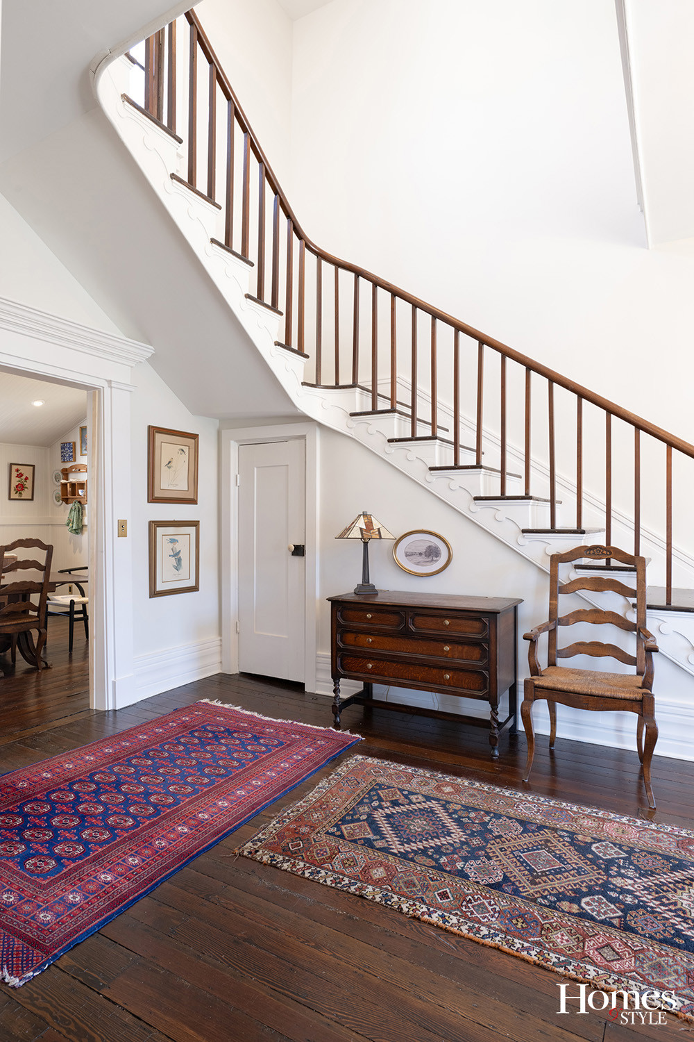 So, they took the house down to the studs and rebuilt it with fierce attention to authenticity, working closely with the Liberty Historic Preservation Board on every exterior change. Their general contractor, Ken Personett, a Liberty homebuilder who had gone to college with Karen’s father, guided the work, sourcing craftspeople to recreate the original Greek Revival millwork, including the signature 16-inch baseboards. Old-growth heart pine flooring was tracked down through specialty mills in Georgia. The original staircase, largely intact after the fire, became the emotional anchor of the entire restoration. The Gerhardts’ design philosophy was elegantly simple: improve everything, change nothing.