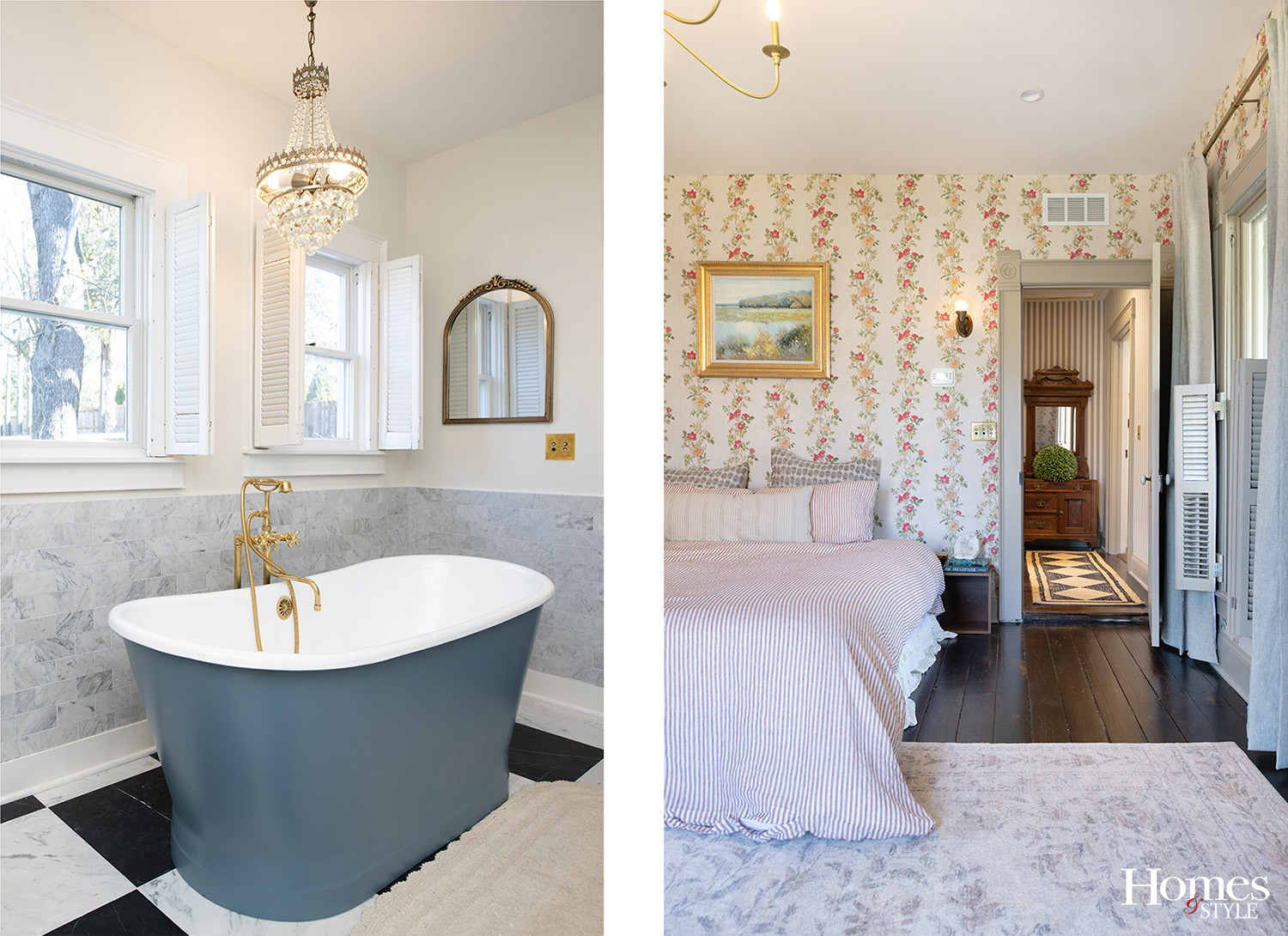 Upstairs, the children’s room features Alice in Wonderland wallpaper, a nod to the fact that Lewis Carroll’s beloved story was written right around the same time the house was built. The primary suite now boasts a dream bathroom complete with a claw-foot tub, marble shower, and chandelier. The charming side porch, which miraculously survived the fire, was lovingly restored as well.