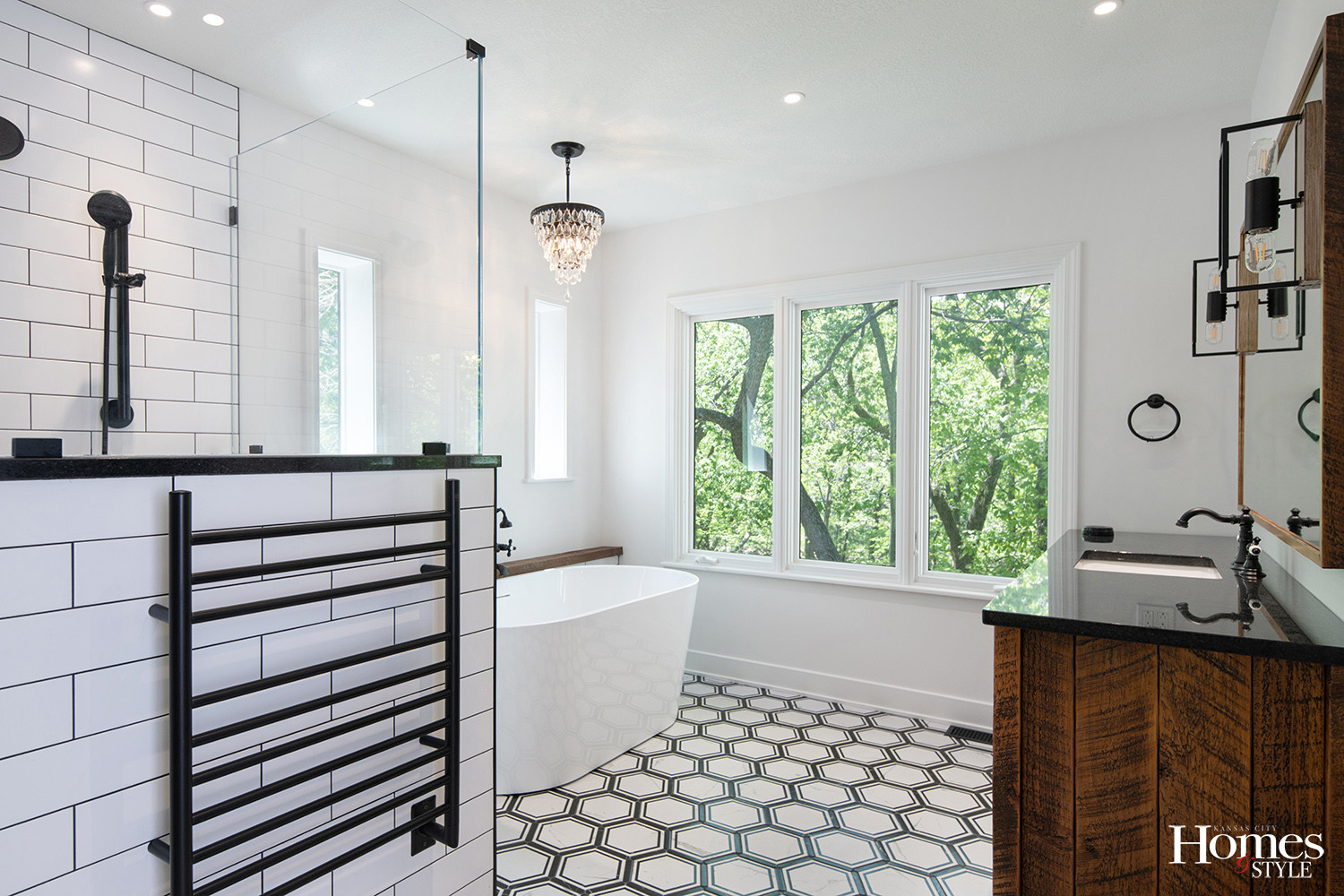 A large white and black hexagon tile adorns the bathroom floor while the shower floor repeats the hexagon shape but in a much smaller black tile. Classic white subway tile covers the shower walls. Black quartz countertops grace the vanities, and the sinks and tub feature black vintage-inspired faucets.